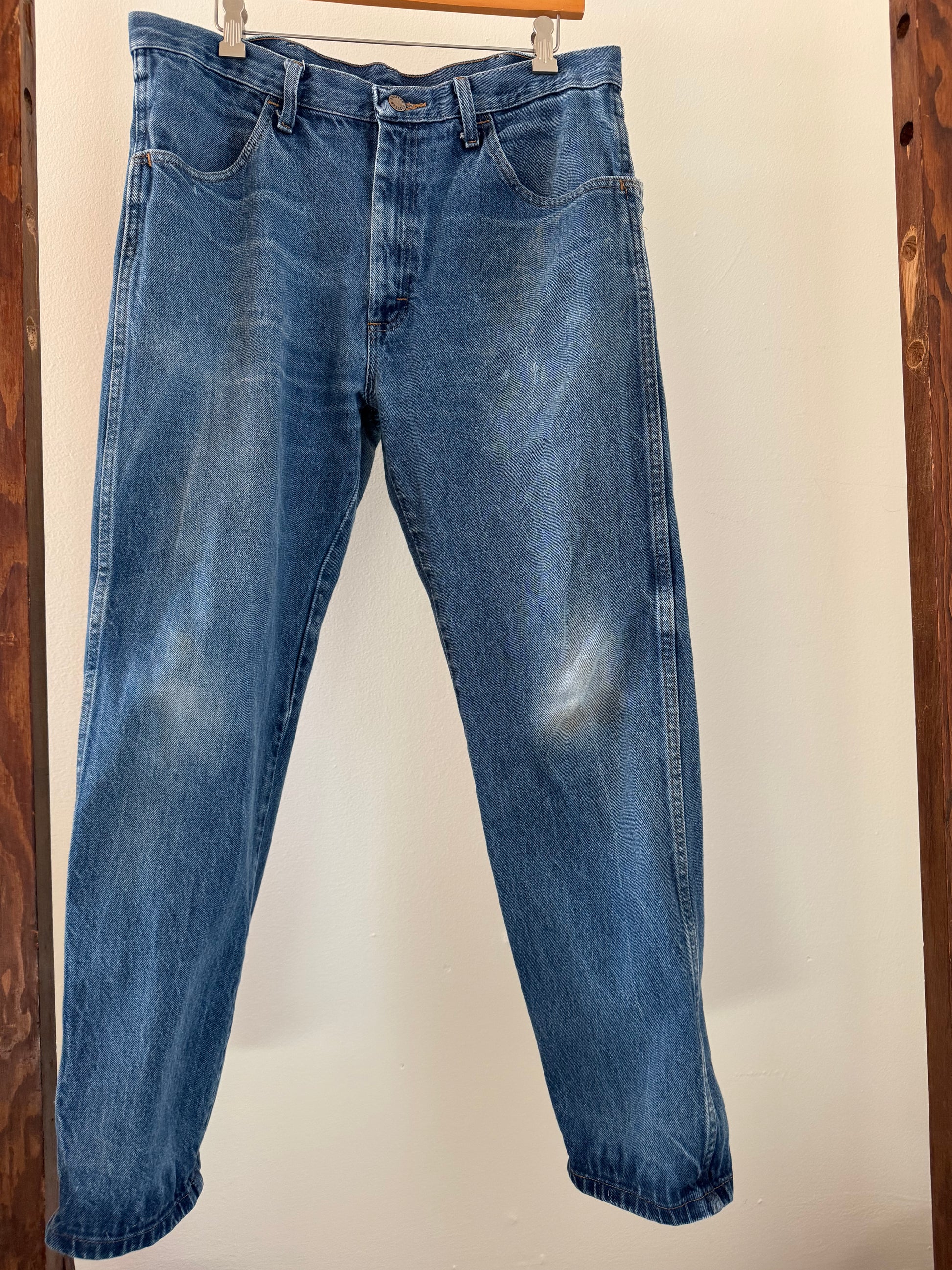 Great relaxed easy fit in a nice broken-in wash. Rich medium blue base.