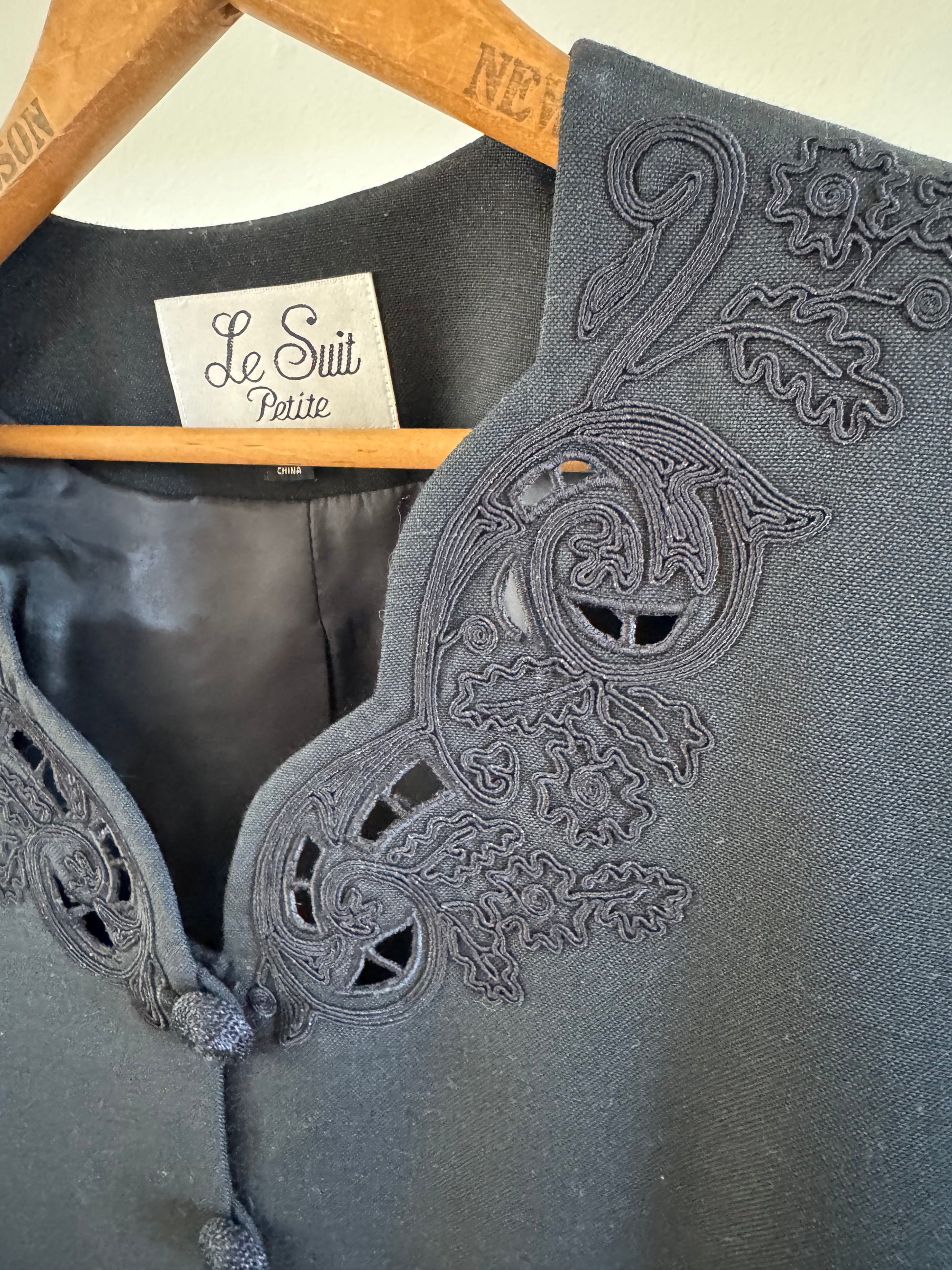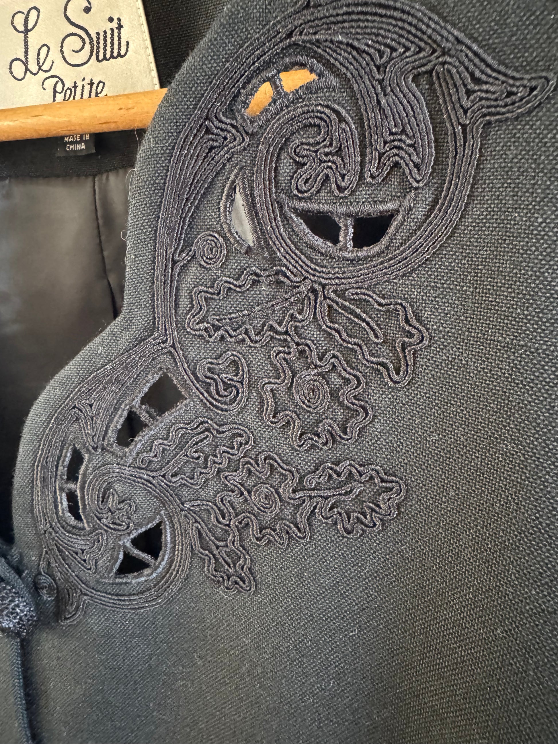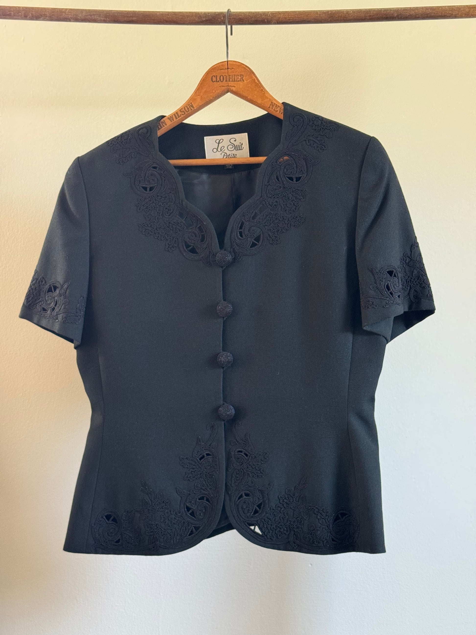 Stunning vintage suiting piece with crewel embroidery and cut outs, gorgeous button front. Style it with the matching mini skirt or with a men's pleated trouser.