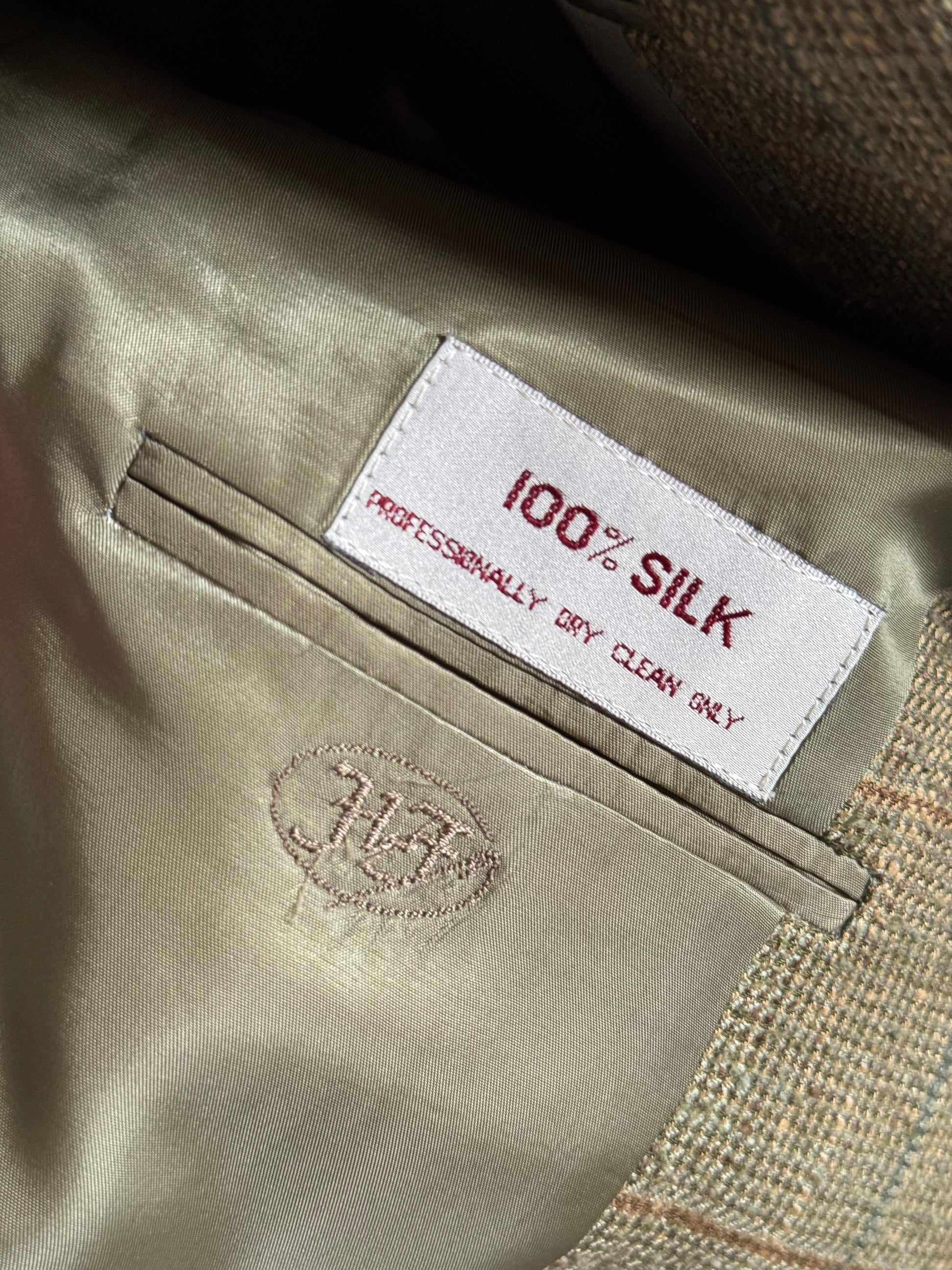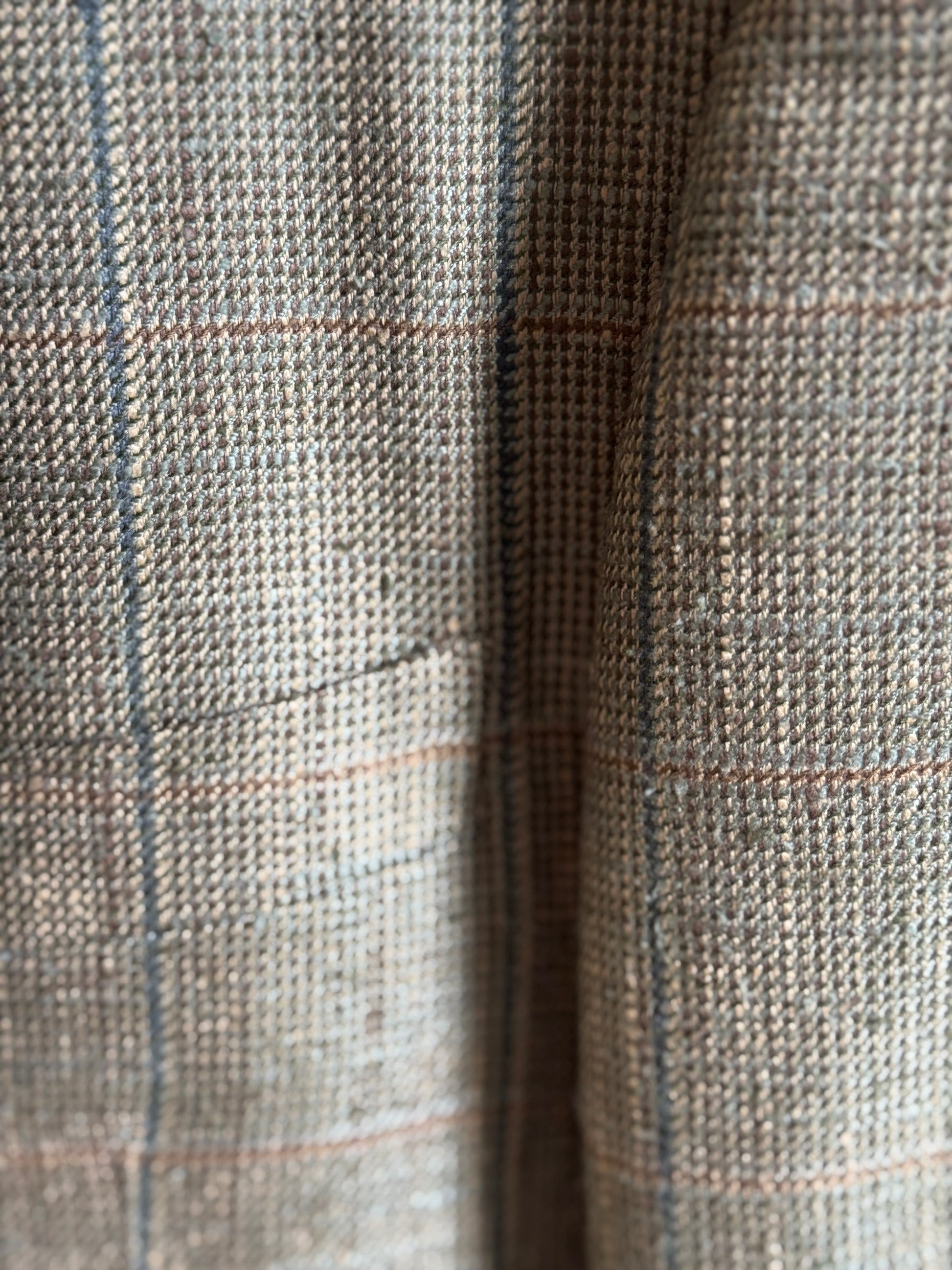 Absolutely love the silk fabric of this menswear sport coat! Great combinations of colors for a subtle plaid with a slight sheen. Wear this tossed over a dress or with all denim and sandals!